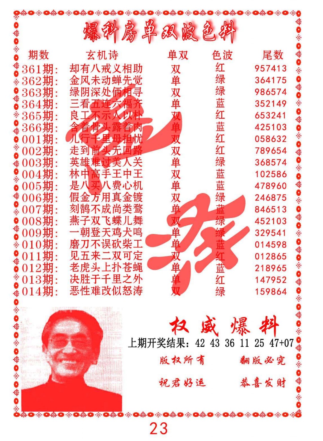 014期爆料房单双波色料[图]